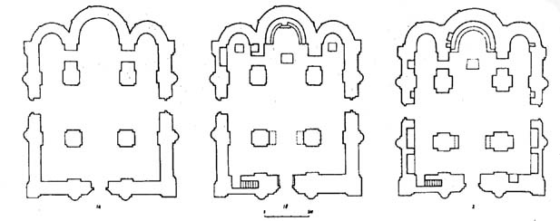 Уровень пола обоих горизонтов в апсидах был выше на 0,20-0,30 м уровня полов остальной площади храма. Это объясняется тем, что в алтарной части пол обычно приподнимался.