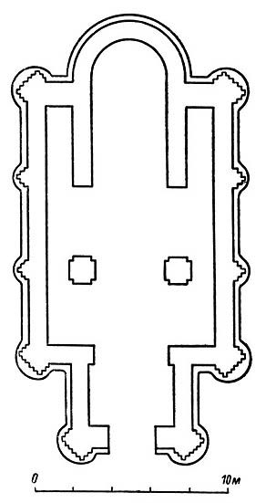 В план-реконструкцию, опубликованную И. Д. Белогорцевым, можно внести некоторые уточнения (рис. 148). Прежде всего необходимо отбросить окружающую здание облицовку, как явно не относящуюся к первому этапу строительства храма (вне зависимости от её назначения). На чертеже Белогорцева размеры здания не вполне точно (правда, очень незначительно) соответствуют размерам, указанным им в тексте. Если при-