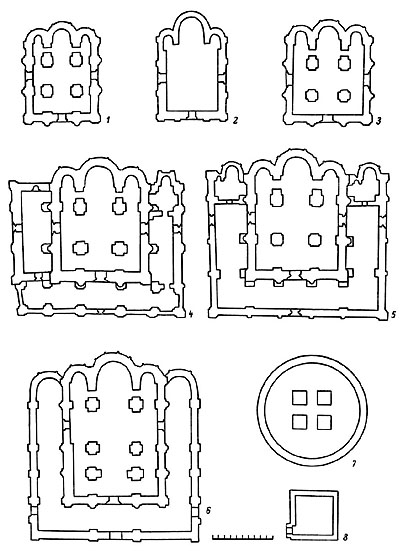 Интенсивность строительства в Смоленской земле в конце XII - первой трети XIII в. позволила создать здесь две самостоятельные строительные артели, вероятно княжескую и епископскую. 14) Постройки, возведённые их силами, различались не только строительно-техническими деталями, но и архитектурными формами. Зодчие второй артели (возможно, это был всего один зодчий) в построенных ими храмах применяли иную плановую схему (рис. 188). Судить о том, какова была объёмная композиция этих храмов, трудно, поскольку ни один из них не сохранился на полную высоту. Внешне их планы выглядят несколько проще, так как лишены профилированных пучковых пилястр и большой, сильно выдающейся полукруглой апсиды. Однако раскопки храма на Протоке показали, что пи-