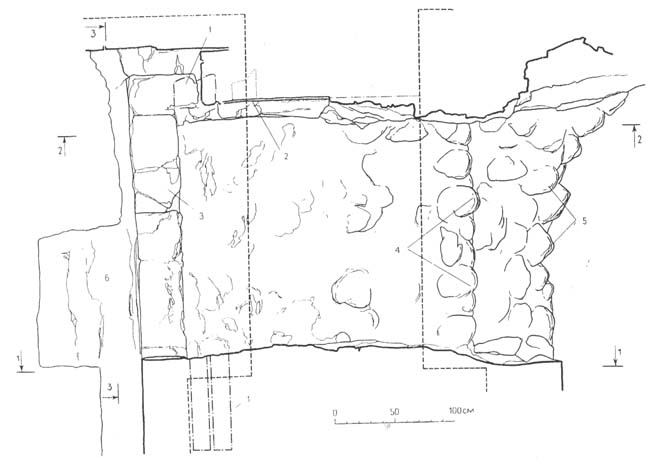 На выступе у средней лопатки сохранились фрагменты почти сплошной затирки без офальцовки камней. В отличие от восточного выступа, кладка однородна, но также состоит из постелистых камней (примерно 17 x 80 х 56 см), уложенных плашмя. И здесь встречаются такие же плинфы, как в восточном выступе. Эта кладка сохранилась на 65 см выше древнего пола 46).