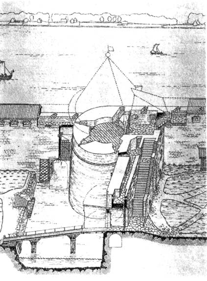 Общий вид крепости Орешек. Рисунок В. М. Савкова к проекту восстановления.