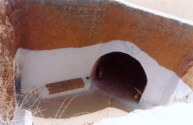 Общий вид жилища берберов. Спереди - вход, вдали белым обведен внутренний двор. Конечно берберы не обвоидли ничего белой краской в древности, это сделано для того, чтобы туристы не падали